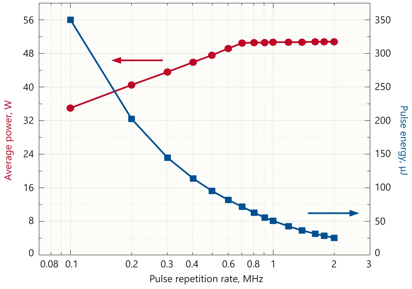 3) At 1 MHz. Please see graphs for power vs laser pulse repetition rate of FemtoLux series lasers.
