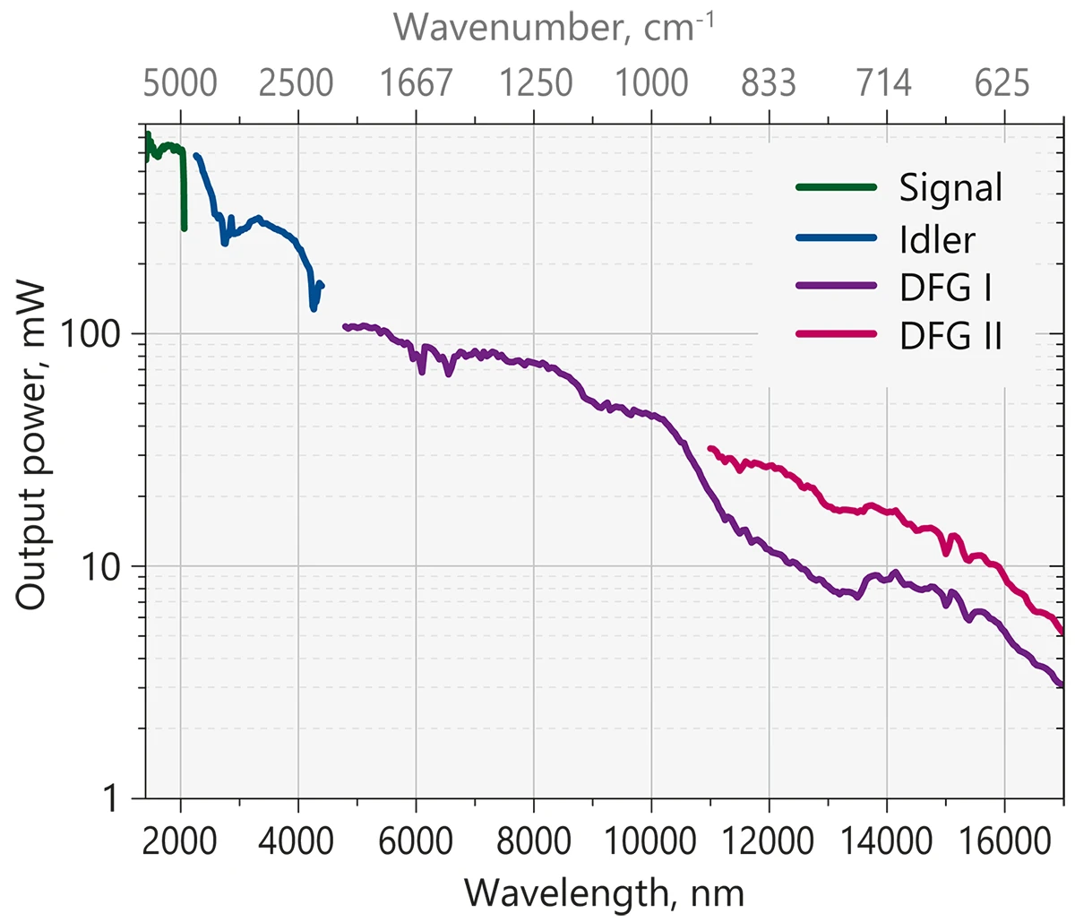 波長可変範囲は1403 – 2020 nm (Signal)、2250 – 4400nm (Idler)、5000 – 17000 nm (DFG)と広い波長範囲に対応し、線幅は全波長可変範囲で< 4 cm-1です。